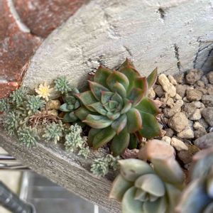 大量質問失礼します。 寄せ植えに入っていた多肉植物ですが、 どなたか名前わかる方いましたら、 教えてください🙇♂️ 写真中央にあるエケベリアのような 多肉植物です。