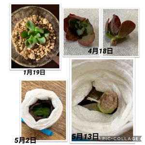 セダム 宝珠💚 1月にセット買いしたのですが なかなか落ち着かず。グラグラで ころりと転がり 5月まで 平置きしてたのですが 根出ず😥 セダムだし ダメ元で リエール式フェス巻にしてみました。11日後に見たら😲 根が😂出てました❣️ 下葉は2枚枯れてましたが 成長点は無事。 やっと安心して植え付けました♪
