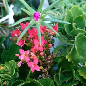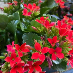 この花はベニベンケイ(紅弁慶)です。 その名前は切った葉っぱからも根を出して育つほど乾燥にも強く強靭なことから弁慶に例えられたのが由来とか…。 短日処理をすることで1年中花を咲かせることが出来ます。 花色は赤のほか白・黄色・ピンク・オレンジ・緑があります。 マダガスカル島原産。 ベンケイソウ科カランコエ属の多年草
