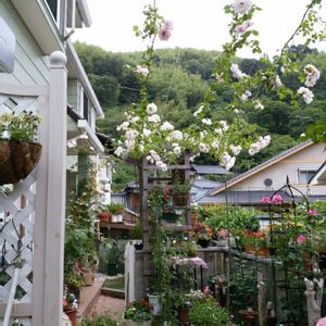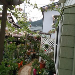 この五本の柱につるバラ4種類、クレマチス3種類を巻き付けるようにしています それぞれのつるが、かなり暴れていましたので、お義母さんとほぼ毎日、剪定と誘引のやり直しをしました かなりスッキリしました 本を読んで剪定をどうするかは知っていたものの、バシッと切るのがかわいそうで、もったいなくもあり、踏ん切りがつかなかったのです。 そこへバラの剪定の知識はないのですが、華道の知識とこれまでの経験は、認知症といえども体が覚えているらしく、「その古い枝は、新しい枝を邪魔しているし、バランス悪いから切った方がいい(▼∀▼)」とか言って、ドンドン、切らせる方向へ持っていき、つい私もそれに納得しながら、かなり切りました 普通、これくらいの強剪定は、冬に行うと記憶していたのですが、まあ、いいかと思い、思いっ切り切りました 今日も夕方の水撒き後、バラ/紫雲とバラ/アルティッシモを半分以上の分量を強剪定して、誘引をやり替えました これでお義母さんにリードされて、強剪定したのは、つるバラ7種類、ブッシュローズ5種類、クレマチス3種類となりました お義母さんから学んだことは、思い切りの良さです 妻は知らないこと、経験のないことには余り口出しをしませんが、経験のあることに関しては、「もう、全部引き抜いて、ほかの花に換えよう」と、アッサリと言います 私は知識を習得しても、2年目なので、思い切りがつかないのです やはり、経験の差は、大きいと感じました お義母さん、妻よ、ありがとう 追伸 ハーブの剪定をするよと言って、経験があるのかと思ったら、全くなしで、葉がなくなるまで剪定しすぎて、六つの中の一つは瀕死状態なのに、「まあ、心配しなくても、そのうち新芽が出てくるから、それまでに料理の仕方を学習しておいたら😄😄😄」と、笑顔で言われてしまいました ガーーーン でした😨😨😨😨