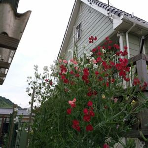4色のスイトピーのカラー・カーテン ソヨソヨと風がそよぎ、ゆらゆらと花が揺れる 薫りが妻のはなを誘い、言葉を発する 「お父さん、スイトピーを切って私にくださいね、いい香りをもっと嗅ぎたいから。でも、今は雨が降っているから、止んだときでいいです」 スイトピーが妻の心を癒やしてくれている スイトピーさん、ありがとう