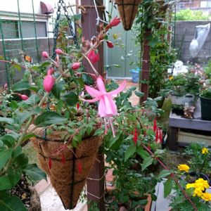 フクシアが咲いた 先日、広島市植物公園で購入したフクシアであるが、詳しい名前は書いていなかったので、分からない 本当にとても可愛い全身ピンク色のフクシアである 妻が初めて気に入ってくれたフクシアなのだ
