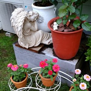 眠りの天使と読書のエンジェルが三色のジニアを楽しんでいます ジニアの下には、姫高麗芝が背丈を伸ばしています 雨の日の「天空のバラの五線譜」の下の宴が始まっています 妻に鉢に植え込んだジニアを演奏席に座って貰ったので見て、というと、これを見て、とても素敵ね、と言ってくれました どう配置したら、喜ぶか考え抜いて並べたのです とても嬉しかったです 喜んでくれた妻とお義母さんに感謝です 小さなことに喜んでくれる二人に感謝です