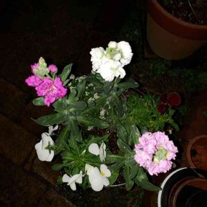 今日の我が家の花、その2。 昨日、寄せ植えられたバスケットを買いました。傷んでいたので、6割り引きくらいで買いました。 ストックを剪定し、寄せ植えのためのグリーンプランツも枯れているところを剪定して整えました。