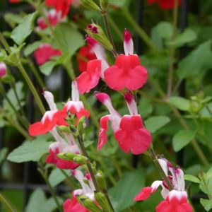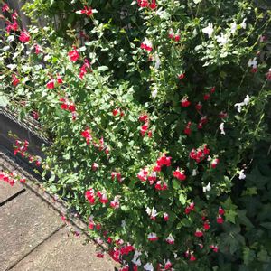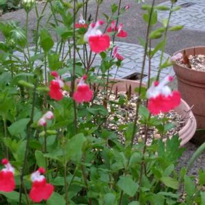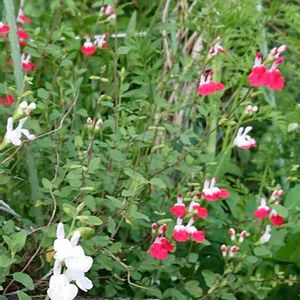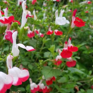 チェリーセイジ ホットリップス 色が変わる可愛い花🌼 温度が低いと白が多く、 高くなると赤が多くなる様です (春以降一度切り戻し) 現在は赤一色です❣️