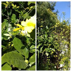 垂れて小さな黄色い花がたくさん咲きます。名前を忘れてしまいました。小さな蜘蛛が隠れていてかわいいのです。