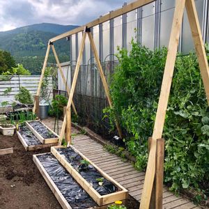 骨組み完成!! 今年のGarden farmの目玉👀 緑のトンネル(笑) キュウリ、かぼちゃ、スイカをここに植えていきます☺️ これでJr.も少しは外に出てくれるでしょう😅