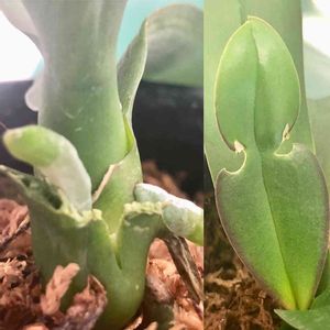 会社の胡蝶蘭。 根っこがでてきました‼️ しかも2箇所から‼️ 1番若い葉は、なぜか変な形に…成長途中で何かあったんだろうか? なにはともあれ、根っこが出てきているので頑張ってくれているんだと思います😄