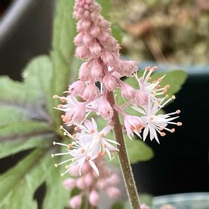 線香花火のような花のティアレアが咲いています✨♫ その横で鉢で育っているヒューケラが元気になってきました🍀