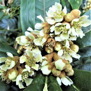 ビワの花が咲きました(*^_^*) ポカポカ陽気で、 日向にいると 汗ばむお天気です((ノ∀`)・゚・。 アヒャヒャヒャヒャ☀ 花言葉…内気 静かな思い 密かな告白 あなたに打ち明ける 青空とコラボシリーズ138 2016.12.12 17.11.14 18.11.13 19.11.15─開花