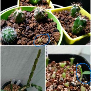 やられました(泣) 去年夏播いた実生サボちゃん、育つの遅くて種類もわからないけどフライレアとかかな😏なんて楽しみにしてた一番のおチビがナメクジにガジガジ(T_T) これはもうあかんやろなぁ。 このpicだけだとテンション下がりすぎるので、すくすくな子を下に。 5月頭にウチにきてからぐんぐん新芽?を伸ばすリプサリスさんと4月播きの実生ちゃんと???な葉っぱ。 室内管理なので雑草とか入らないと思うんやけど、こんな多肉の発芽ってありますか??
