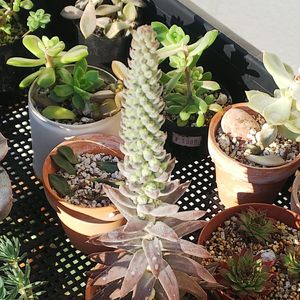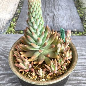 さきほどの「爪蓮華」に引き続き「白雪爪蓮華」です。 この苗は、昨年の12月に買ったものなのですが… もう、花芽がついちゃってるんですね~ この真ん中の株、大きいくせに春になってもほとんど子株を吹かないなあ? と思っていたら、花芽だったからなんですね…、 爪蓮華は、子株から3年目くらいに花芽をつけるらしいのですが、 そんなにすぐに花芽がつく株を売らないでくださいよ~…、(笑) と、いうわけで… 真ん中の大株は、花を咲かせるべくタワー型に成長中です。 周囲にも数本、花芽をつけているらしきちっちゃいタワーができてますね~。 しかしここから花が咲くまでが長いんですわ…、 爪蓮華の花の時は、同じく夏にタワーができたのに、咲き始めたのは12月でしたから。 そして咲き終わったのは7月くらい… こちらのほうは、そこまで花芽タワーは大きくないので、もう少し早く咲き終わるかなあ? なかなかロングスパンな花芽ですよ~。 過去の様子は 🏷はなずきん白雪爪蓮華 で見られます。