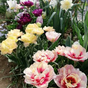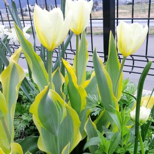 シマシマ葉っぱのチューリップ、ピューリシマブロンド🌷 今年初めて植えてみました😊 ①②④⑤花はクリーム色でシンプルカッコいい系 ③斑入りの葉っぱが、花壇奥にあっても目立ちます🌿
