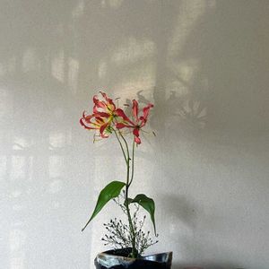 花を迎えて 〜 私にしては 珍しいお花で悩む 「 グロリオサ 𓂃◌𓈒𓏲𓆸 」 どんな風に? こんな感じで... .... (oˆ罒ˆo) 秋を意識した花器 おはようございます 火曜日の今日は 🔆。° 真っ赤な南天 蕾と葉が美しい😍 ( 日曜日の雨 散歩 より )