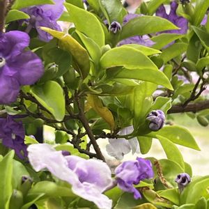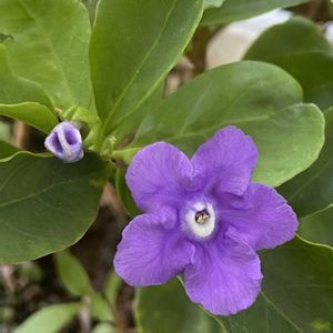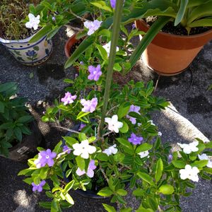 「ニオイバンマツリ」 9月27日am5:59頃 ✧p📷qω•,,´)パシャ✧ このくらい咲くのは、今春からもう何度目だろうか? 4回は咲いたと思う。 茉莉花と同じで気温さえ合えば、何度でも咲くのかもしれないです。 屋上に来ると良い香りがしています。 このニオイバンマツリが、僕としては初めての木を育てるきっかけになったんです。 5~6年程前に、姉から、これいらないから育てる❓ と言われて貰ってきたのが、このニオイバンマツリでした。 手渡された時に、えっ!軽い‼️と思った。 鉢も小さかったので、姉から鉢も貰って、屋上に行って鉢から出すと、土が殆ど無くなっていた。 貰った鉢へと植え替え数日が経つと、付いていた葉っぱが全部落ちた😲 死んでしまったのかと思い暫くそのままにしておくと、紫色の葉っぱが出てきた。 あのまま捨てないで良かった。 姉宅には、もう1鉢ニオイバンマツリがあった。 屋上のニオイバンマツリも段々元気になって花を咲かせるようになった。 見事に咲いた時に、姉宅のニオイバンマツリを見ると、僕の勝ちですね。 花の量が全然多かったです。 そんなことがあり、 大きくなったニオイバンマツリを3回ほど鉢増ししてきました。 冬になると、落葉樹では無いのに、葉っぱが落ちますが、春にはまた芽吹いてくれます。年に1、2回 肥料をあげています。 手入れの仕方がまだまだ分からないですけど、年に何度も咲いてくれて嬉しいものです。