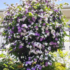 ニオイバンマツリ(匂番茉莉)💜🤍💙 ナス科ブルンフェルシア属 5/10近所を散歩してると、良い香り たくさんのお花を付けた匂番茉莉 下に置物のワンコ🐶も一緒にパチリ 🏷️ワンワン祭り 名前の由来 ジャスミンとは科も属も違うのですが、匂(ニオイ)があり蕃(外国/異民)から来た茉莉(ジャスミン)を意味しているそう 花言葉は、「幸運」「夢の名」「浮気な人」「熱心」 有毒植物 全ての部分が有毒成分 犬や猫などが誤って摂取すると嘔吐や痙攣、ふらつきなどの症状が現れ、最悪の場合は死に至ることがあるそうですよ