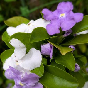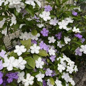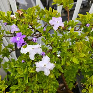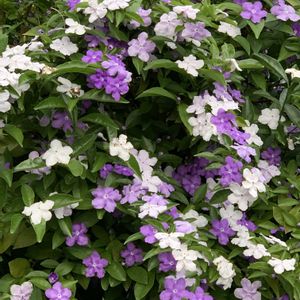近所で咲いていた ニオイバンマツリ🌿 グラデーションのように咲く花々が美しいです💜 紫から白に変化していくお花だそう♬ 初めて見た時、この色にびっくりしました😆