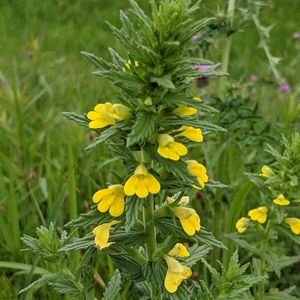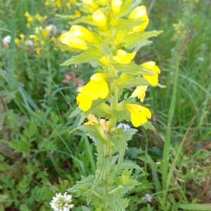 セイヨウヒキヨモギ(西洋引蓬) ハマウツボ科セイヨウヒキヨモギ属 土手に園芸種のようなお花が ずらっと並んでいます 優しい黄色で背丈も高くありません 増えるのかなぁ 1973年に千葉で確認され 関東以西に自生している帰化植物 他の植物から栄養を取り、自らも光合成をする、半寄生植物 茎は分枝せず直立 葉は密に無柄、上部で互生 下部は対生し茎を抱く 先は尖った狭卵形で縁に鋭鋸歯 全体に白毛と、腺毛があり粘る 茎上部の葉腋に黄色の唇形の花 花期は5〜6月