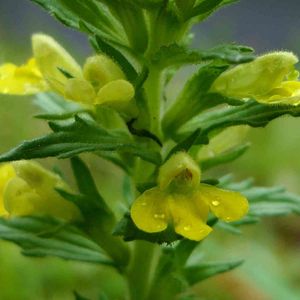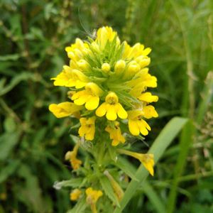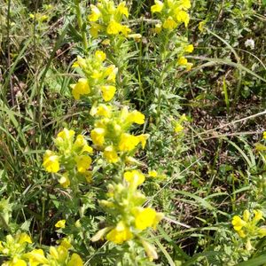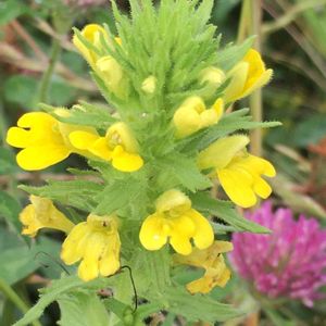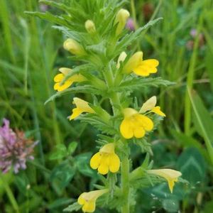 セイヨウヒキヨモギ ハマウツボ科セイヨウヒキヨモギ属 変わった形の花をつける半寄生植物。 全体に腺毛があってとてもベタベタします。