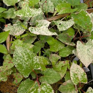 斑入りイタドリ(斑入り痛取) ⚪︎岩手県自生種 ⚪︎普通葉と比べて、迷彩柄なのに よく目立ちます。 別名:スカンポ、イタンポ、 ドングイ 生薬名:虎杖根(コジョウコン) 学名:Reynoutria japonica 分類:タデ科ソバカズラ属 耐寒性多年草 花言葉:回復、見かけによらない 開花時期:8〜10月 草丈:1-1.5m 葉に模様が入る斑入り品種のイタドリで岩手県自生種から発見され、増殖しました。 晩春から葉の模様が出始め、秋になるにつれくっきりと模様を魅せてくれます。 白い模様のため、白〜黄色の花も映え全体的に綺麗な印象です。