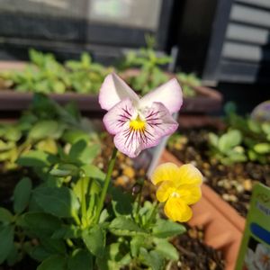 ビオラ 『品種不明』 今日の湘南は薄曇りだけど、過ごしやすいです。 室内で水につけてた『ブラッシュストローク』の種に根っこが生えてきたので、早速土に植えてたら、 あらあら?! こぼれ種で育ったビオラちゃんが、いつの間にか咲いてる♡ この子はおそらくブランド苗の子だと思うけど、たくさんのブランド苗を育ててたからなぁ…💧 はて〜?!お名前なんだっけな?
