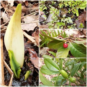 裏山で、 水芭蕉、 セリ ヤブコウジ🔴 アオキの実🟢