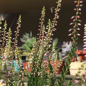 多肉棚の前 もう動かせない状態、の巨大プランター コレって今日の花、エリカかな😉 …と思ったら カルーナブルガリスだよ〜ってJ子さんに教えてもらいました。 ありがとうございます💖