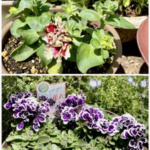 ビオラパンジーの寄せ植えを解体して、ペチュニアを植え付けました😃寄せ植えに入っていたのに他の植物で押しつぶされて隠れていたアイビーも一緒に植えました😆✨ ペチュニアは近所のホームセンターで何故か他のカラー(黒真珠、紅水晶)しかなくて諦めていたのを、たまたま行った他のホームセンターで見つけて購入したお気に入りです😆待機中に他のペチュニアと一緒にナメクジに食害に遭い、新芽を少し食べられてしまいました😱
