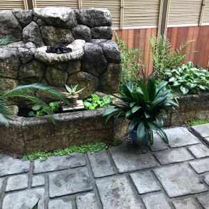 ウッドデッキの床をモルタル造形で床平板風に変えました。四つ目垣もウリン材の目隠しフェンスに。。以前作った奥にある石積みは循環式の水場。