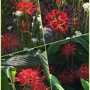 《今日のお花・ヒガンバナ》 畑に、赤いヒガンバナがたくさん咲いてきました❣️。 上段は、ニラの花とのコラボになってますね😅💦。 下段は、秋ウコンの葉の間から、あちこちにドンドンと咲き出しています😃‼️。 *熊本はまだまだ暑いのですが、植物界はちゃっかり秋になってますねぇ🤔💢。 …植物は季節を御存知ですね☺️🍃🍂🍁。