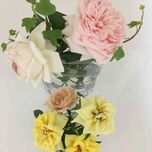 バラ ピンク アフロディーテ ベージュ いおり イエロー ポールセンローズ グリーン ヘデラ 今年の鉢植え薔薇さんたちは暑いけど元気です。