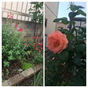 おはようございます😊 我が家の放置気味花壇にもバラとチェリーセージが咲いていました✨ 昨日朝撮影したpicですが。 このバラ、7年前に義父が勝手に挿し木したモノで😅、種類など分かりません💦