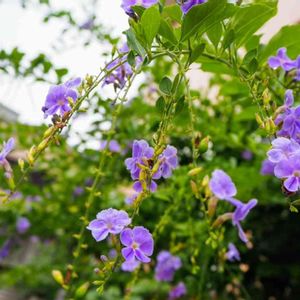 舞妓さんの花かんざしが浮かびます。 名前が判明しました。 デュランタ。 これは、紫色が濃く、うっすらふちがみえるので、デュランタタカラヅカかと。 美しい花です。みとれます。