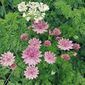 🩷ピンク & 🤍ホワイト ①アストランティア ローマ 白から遅れてピンクも咲きました🩷 ②アストランティア フローレンス ただいまキラキラ☆満開です ③ムスクマロウ ホワイト ④ムスクマロウ ピンク ⑤ラベンダー あとちょっと🌿