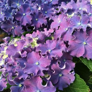 ①② 四季咲きルエリア やっと1つ咲きました💜 ③紫陽花(HBAカーリースパー クル) 長く楽しめるよう1房だけ色付 いているのを選びました❤️💚 自分へのご褒美に! 良く働いていますからー🤭 ④レモンの花 まだ実が付いていて時々利用し ています🍋🤍🤍 ⑤ユウゲショウとタツナミソウ 昨年ポットに植え付けて置いた のが咲きました🩷🤍🤍 🥰🌿