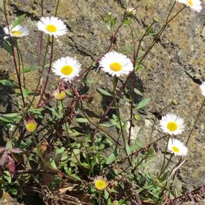石垣に張り付いて、かわいいお花を咲かせていました。 ハルジオンに似た小ぶりのこの子はだれですか?💛🎶🍀🤍💛🤍🤗🎵 moriさんが教えてくださいました。💛🤍🎵😊