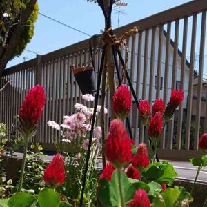 ストロベリーキャンドルがいい色になりました😌 その奥のピンク色の花は桃色タンポポ💓 冬の間は、ただの一本の棒だったジャカランダにも新芽が出てきました😍😍😍