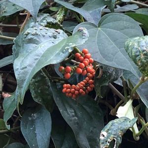 フウトウカズラ (風藤葛) コショウ科 コショウ属 海岸に近い日当たりの良い山の中で山芋の様に他の木に絡まるように生えていました。英名がKadzura pepperなので コショウが採れるかなと思ってましたがどうやら似て非なるものの様です。コショウ属なのにねぇ。