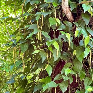 虫がたくさん垂れ下がっているように見えますが、これでもお花です。 秋に赤い実がなります。 フウトウカズラ(風藤葛) コショウ科コショウ属