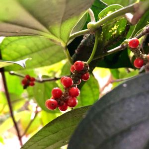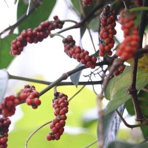 フウトウカズラ(風藤葛)の実 直径3mmほどの小さな朱色の実が、幾つか房になってついています。 コショウ科コショウ属 常緑性の木本の蔓植物 コショウのような辛みや香りはなく、残念ながらコショウの代わりにはならないそうです。
