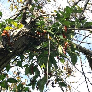 つる性?赤っぽいオレンジ色の実が房状になっている