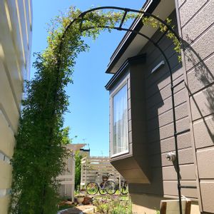 去年まではウッドフェンスには藁たせてたけど難しくって、アーチに変更。 今年はどこまで伸びるかなー!