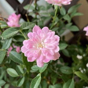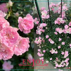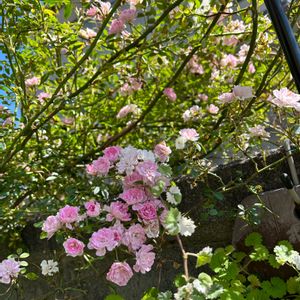 No.21 ミニバラ 真珠貝 ピンク 小さな鉢植えのミニバラ、 ワイヤーにぐるぐるに絡ませてあったのを全部解いて庭に植えたら 葉っぱは山椒の葉くらいの大きさで 花は直径4cmほどのミニバラが たくさん咲きました♪