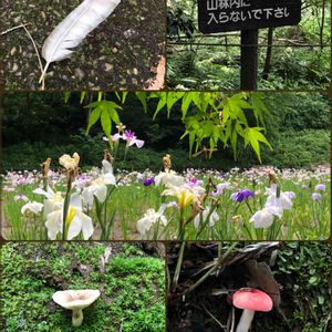💜🤍菖蒲田のある自然の森を散歩してきました🌳🌲🌳🌲 💧あちこちにあるマムシ注意🐍の札にビクビクしながら遊歩道を歩いていたら大きな羽が🪶⁉️ 縞々模様の綺麗な羽です なんの鳥さんかなぁ🦅🦉 可愛らしいキノコも発見🍄 🌳🌲木陰は涼しくていい運動になりました❤️