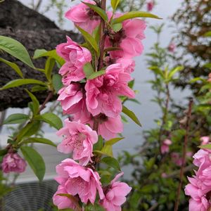 👍モモの花ですが なんと、オヒョウモモ🍑だそうです(^-^) 🌿葉がニレ科のオヒョウに似ていることから命名されたとか?🤭 ③、④のスイセンと一緒に… 素敵なおうちの庭に咲いてました🌸🌿