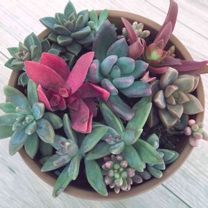 赤っぽい寄せ🎈 フローラ黒田園芸さんの 「12ヶ月の多肉植物寄せ植えレシピ」をお手本に植えてみたつもりですが…なんか違う💦
