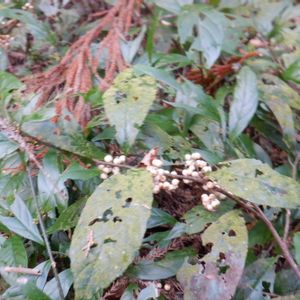 イズセンリョウ(伊豆千両) ヤブコウジ科イズセンリョウ属の 常緑低木 分布 本州(関東南部以西)、四国、九州、沖縄 冬の白い実、 ひっそりと、イズセンリョウが、 実をつけていました。 伊豆神社に多かったので、ついた名前だそうですが、東海地方の山林でも、時々、見かけます。 枝は、真っ直ぐ立っているのも見かけますが、倒れているのも、よく見ます😅 虫喰い?の葉っぱも、よく見かけます。