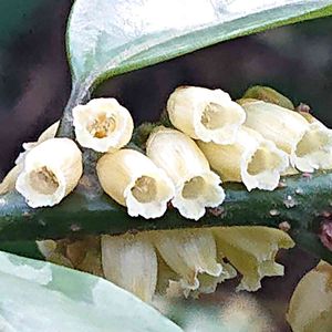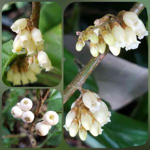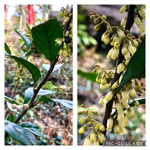 伊豆千両のお花 ヤブコウジ科 白と言うより乳白色💠 5㍉程の小さなお花が枝の下に 固まって咲いています。 釣鐘型で可愛いです😍 左下の実は 昨年12月初めに🤳