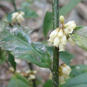 ぷりぷりむらさんから、イズセンリョウと教えて頂きました。ありがとうございました! 1年前から何の木だろう?と気になっていました。「名前を教えて」に投稿したかったのですが、写真がうまく撮れていなくて、やっと今年投稿するができました! アセビに似ていますが、花のつき方や形が少し違いました。 シャシャンボにも似ていますが、これは花軸に苞がないので違うみたい。 イワナンテンも少し似ていますが、これは枝が垂れさがっていないし、イワナンテンは九州には自生していないようです。 林の中に生えている高さ80cmぐらいの低木でした。 葉は長さ8〜10cmぐらい、幅3cmぐらいで、厚みがあり、ごく浅くて不揃いな鋸歯がありました。