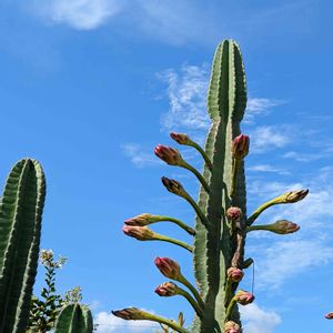 通りすがりに発見(º ロ º๑)! 柱サボテンに花の蕾ーーー! ✧ฺ・。(✪▽✪*)・。✧ 初めて見た! こんなふうに蕾つくのね〜💓 咲いてるとこ見たかったー。